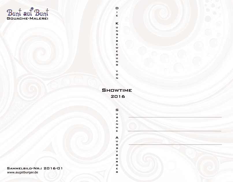 Aus dem Schaffenswerk "Bunt auf Bunt" können Sie viele Bildprojekte bis weit in die Anfangsjahre der Achziger zurück verfolgen. Kontinuierlich wird dieses einzigartige Bildersortiment mit einer fröhlich bunten Mischung an hochwertigen Kunstkarten aus der Gouache-Malerei von der Künstlerin Susanne Augstburger erweitert. Handsigniert werden diese kleinformatigen digitalen Kunstdrucke exklusiv nur in diesem Online-Shop angeboten, allerdings nur die erste Auflage.